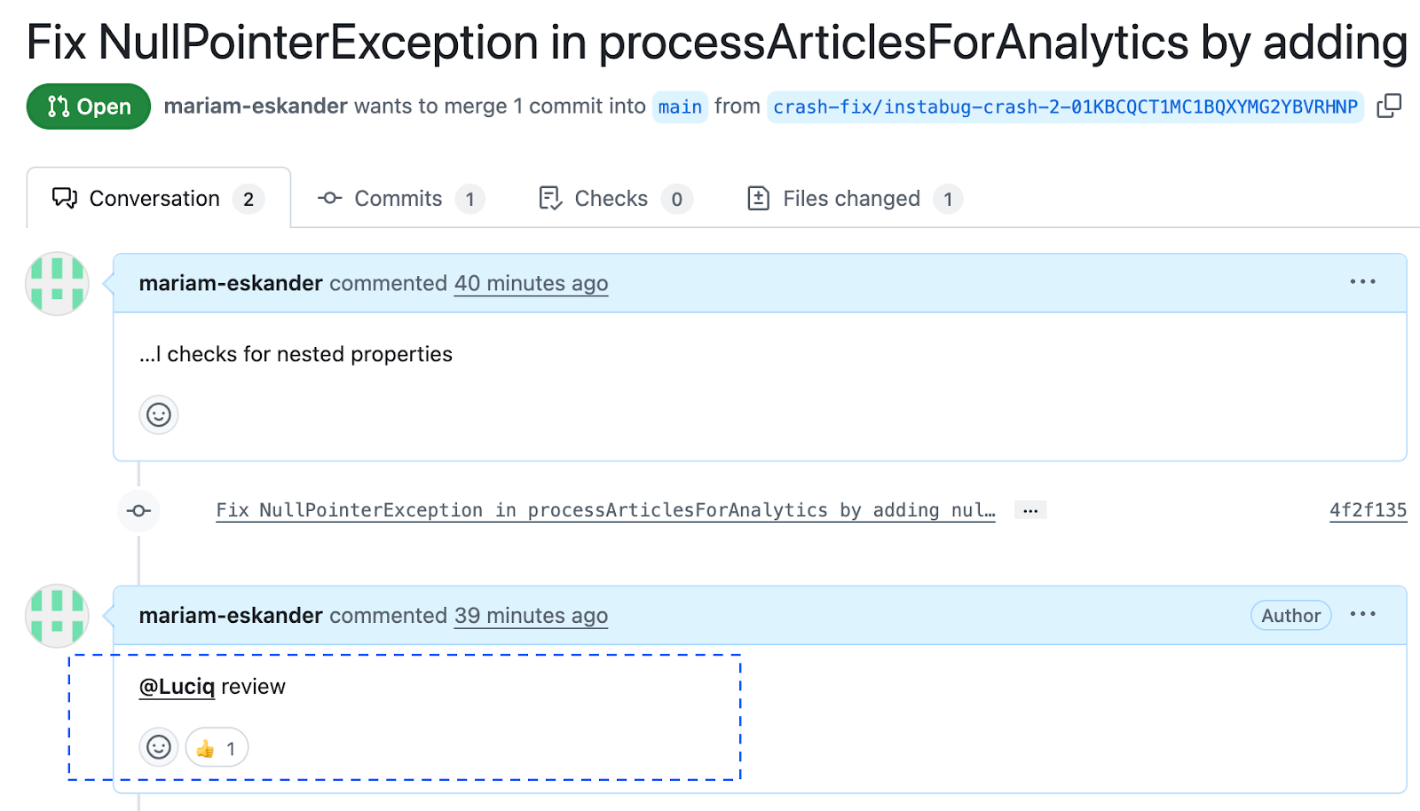 @luciq reviewLuciq will immediately react to your comment with a thumbs up emoji to confirm that the review has started. Once the analysis is complete, Luciq will post the PR summary and risk assessment as a new comment.
