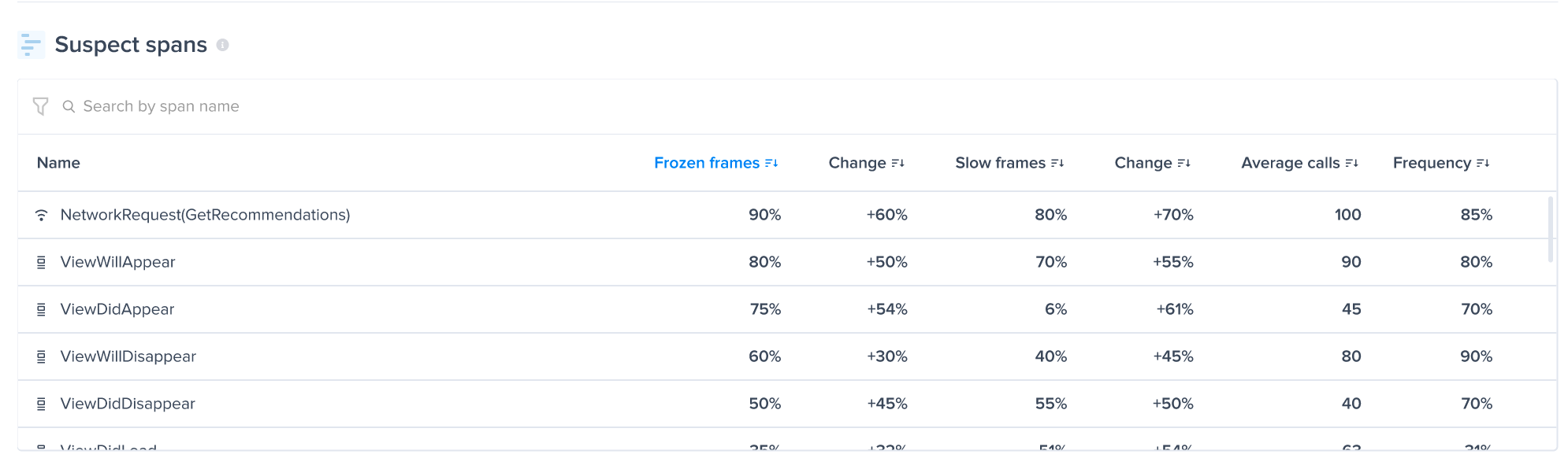 - Frozen Frames %: What percentage of the occurrences of this span correlated with a frozen frame.