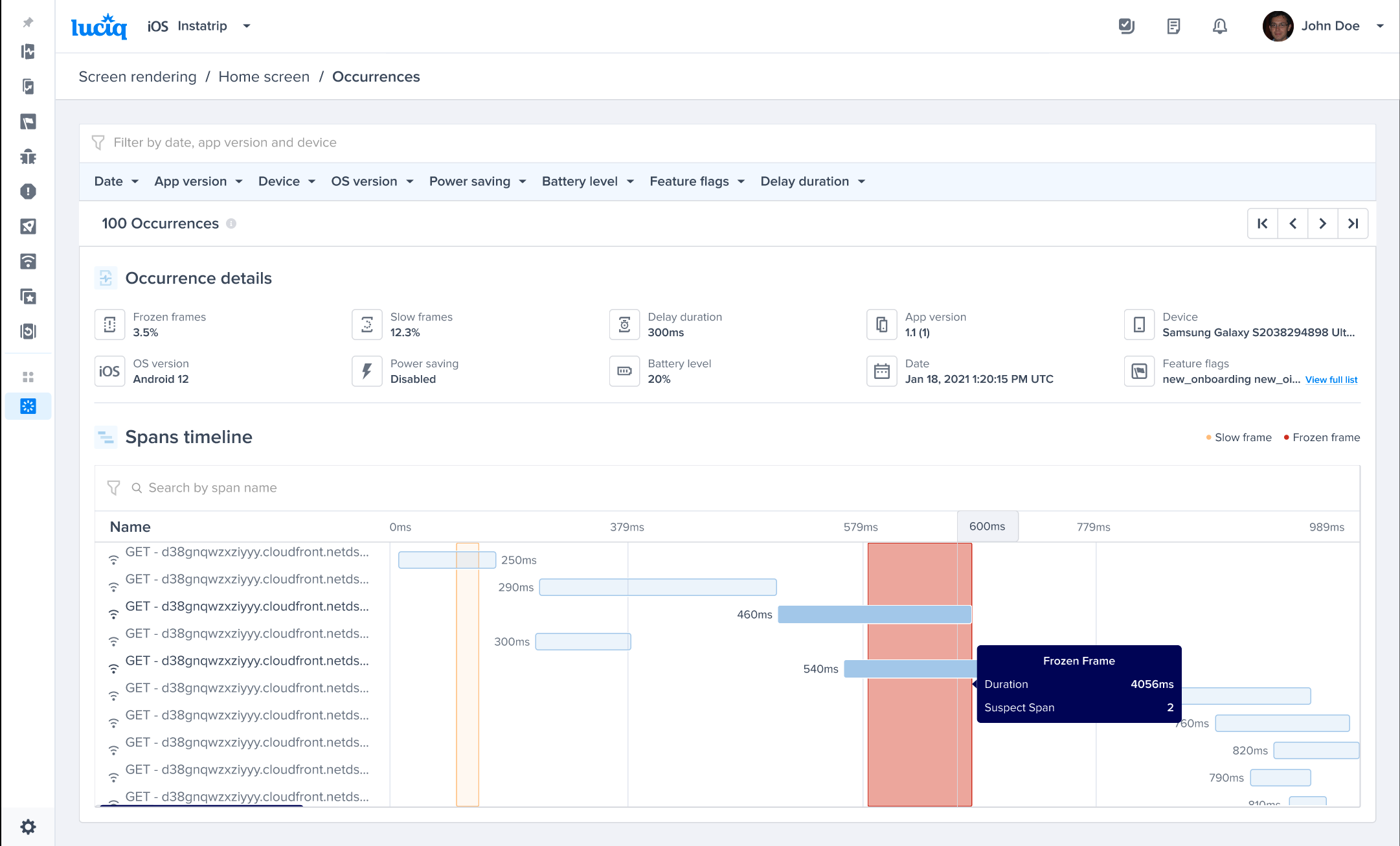- View metadata about each occurrence, including frozen and slow frames %, device and app information, and other parameters.