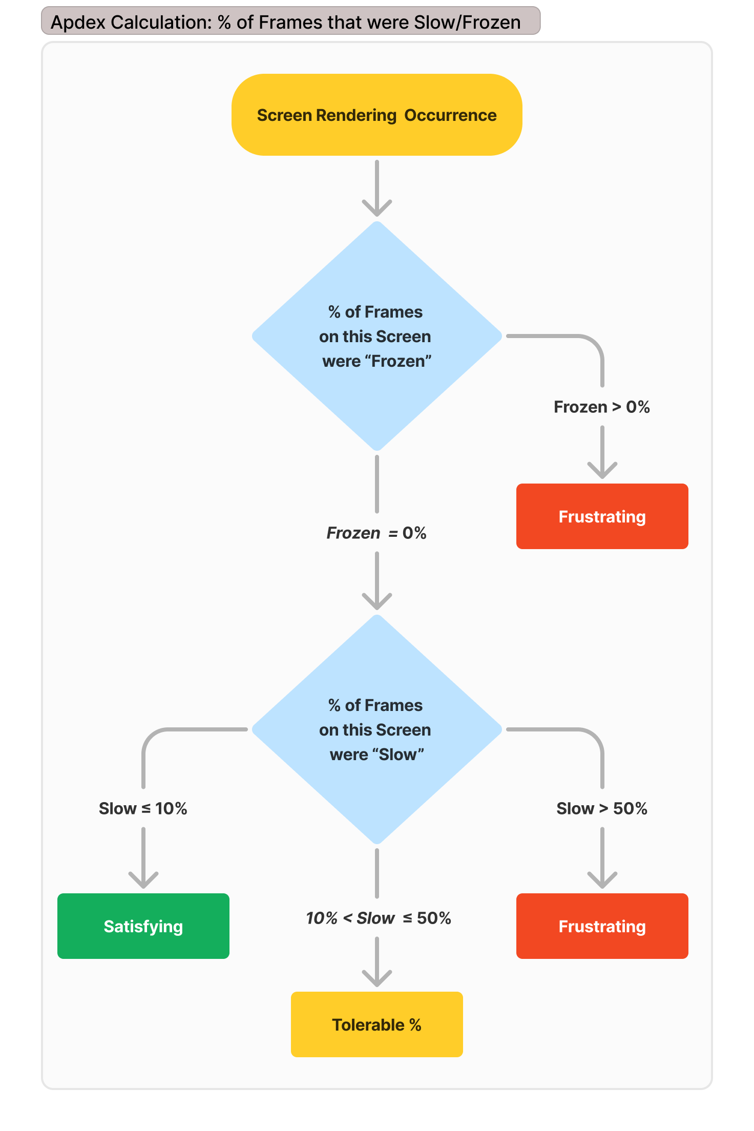 Every screen visit is categorized based on the frozen frames % and slow frames % of that occurrence. Based on the following logic: